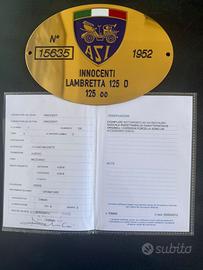 LAMBRETTA Innocenti cc. 125 D del 1952 sottoposta ad un perfetto restauro sia di motore che di vernice e cromature, mezzo riportato a nuovo tutto assolutamente originale. La Lambretta è iscritta ASI ( Automobile Club Storico Italiano ) al 100% Con targa ORO come si puo vedere da certificato allegato. Cont. : Emanuele 340 3103475