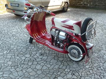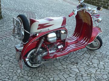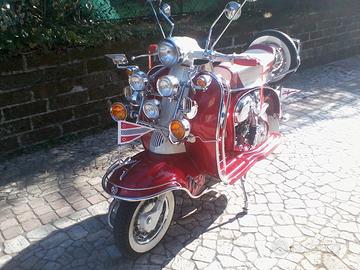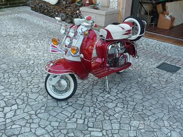 Lambretta del 1961 completamente rifatta ed allestita in stile Mod (Quadrophenia - The Who); quando passa è impossibile non notarla. I vari decori sono evidenziati dalle foto; fari aggiunti, frecce direzionali, impianto audio con lettore MP3, trombe, batteria supplementare. Oltre alla sabbiatura e verniciatura sono stati cambiati moltissimi pezzi originali e rifatta l'accensione. Impianto elettrico a 12V. Perfetta e funzionante in ogni suo componente; non ha perdite e parte al primo colpo. Libretto originale, sono il secondo proprietario. Revisione scaduta. Fornisco anche i carter coprimotore riverniciati. La vendo a malincuore poichè non la uso, anche per sopraggiunti limiti di età. Solo amatori in grado di capire il costo di un simile restauro e la passione per lo stesso.