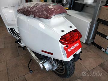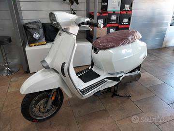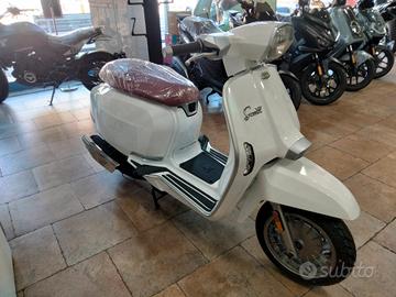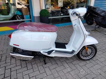 Nuova Lambretta 125 V special 2025, con doppio freno a disco, display analogico digitale in stile Lambretta.Telaio in acciaio a culla portante con calotte removibili posteriori.Motore con raffreddamento aria forzata in alluminio a 4 valvole con catalizzatore e controllo emissioni.