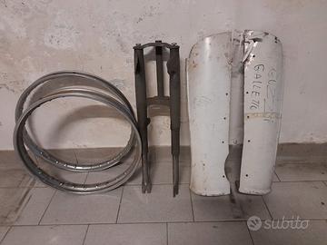 Vendo in stock tutto assieme tutto quello che si vede nella prima foto di copertina . Lo stock comprende un ciclomotore legnano sachs con MOTORE BLOCCATO e duplicato del libretto rifatto negli anni 80 , bicicletta legnano con freni a bacchetta da restaurare , 3 motori ciclomotori da usare come pezzi di ricambio (1 motore Rizzato, 1 motore Garelli , 1 motore Franco Morini ) , 1 paragambe Galletto , forcella ciclomotori anni 60/70 .