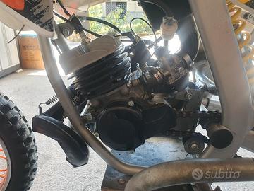 Vendo cross 50 2t unico nel.suo genere. Assemblato con pezzi nuovi documentati. Il telaio ė un telaio lem vecchio modello rinforzato non come quelli di adesso molto piu deboli e piccoli. infatti ė il modello lx3 con ruote 15-12 e mono rialzato. Motore comprato nuovo replica ktm morini 10CV, carburatore phgb dell orto 19 filtro e scarico tutto nuovo di zecca. Vendo solo per passaggio a marce. Prezzo poco trattabile. CROSS MINICROSS PITBIKE MOTOCROSS MINIMOTO 50 2T