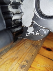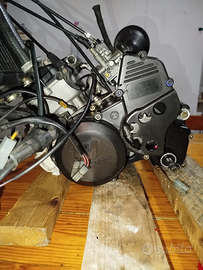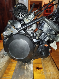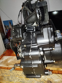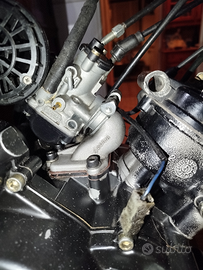 Motore Franco Morini per Malaguti FIFTY. 4 marce, carburatore PHBG 19, modello raffreddato a liquido con radiatore ed impianto elettrico compresa bobina A.T. Ducati energia con leva avviamento e leva cambio. Penso abbia una maggiorazione kit Polini probabilmente 75 cc. Karter in plastica sinistro leggermente danneggiato in corrispondenza del pignone di trasmissione, tutto il resto è perfetto. Il cambio funziona, il motore è libero con ottima compressione