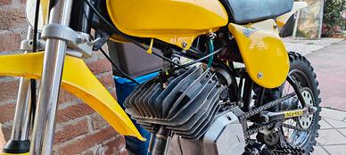 bel crossettino italjet, monta minarelli p6 4r, cilindro 50 lavorato, carburatore 19, espansione su misura, accensione pvl rotore interno. forcelle marzocchi, mono posteriore a gas. figoso.