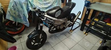 Vendo mini gp base Aprilia RS 125 2t 2002, forcellone derivazione PBS modificato, mono Paioli 3 regolazioni, forcella con molle e olio modificati, motore full power originalissimo, impianto elettrico semplificato, rave elettronica, batteria al litio nuova, accensione originale. La moto ha 30 cv, una vera lama. Motore con banco, biella e pistone rifatti dal precedente proprietario e con all'attivo appena 17 litri. Moto usata l'ultima volta il 23/03, vendo per problemi fisici che non mi permettono di usarla. Possibile provarla in pista alle Cave di Vittorio Veneto. Moto pronta all'uso, si accende con due giri di motorino, estetica grezza. Prezzo poco trattabile. Non serve passaggio.