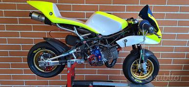 •Minimoto DM 2023 con tutti gli ultimi aggiornamenti (forcellone posteriore rinforzato, freni FORMULA ultima generazione e piastre dello sterzo off-set), con motore GHR flangia 15, preparato pronto gara, marmitta GHR dedicata e carburatore Dell’Orto 15 PHBG, ammortizzatore di sterzo BZM regolabile ;