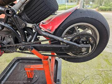 Minimoto DM 50 cc malossi, forcellone posteriore allungato, disponibile anche quello originale corto. Ammortizzatore di sterzo. Raffreddamento a liquido.