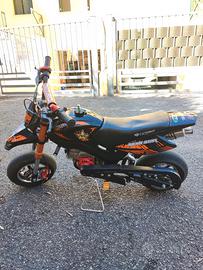 Mini Motard 50 cc, pronta per essere utilizzata, monta gomme slick, impianto frenante rivisto e pedane modificate per aumentarne la sicurezza.