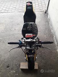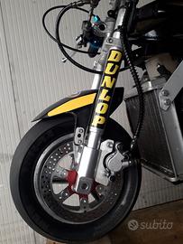 La minimoto monta freni idraulici con disco freno anteriore maggiorato, forcelle in alluminio, corona posteriore in ergal, carburatore da 19 cinese tipo PHGB con airbox, comando gas rapido.