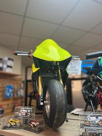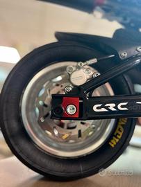 COMPLETA DI: radiatore maggiorato-pompa acqua maggiorata-forcella in alluminio D.28-semimanubri in alluminio-freni idraulici -ammortizzatore sterzo-freno idraulico anteriore discacciati-cavalletto-tappi forcella-cerchi bike racing-sganci rapidi carena.