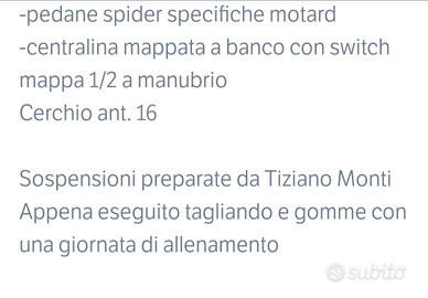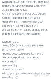 Non targato, 56 ore totali, circa 25 dal rifacimento totale del motoere, disponibile spedizione. Descrizione completa in foto, manopole nuove, grafiche nuove, paramani nuovi, leve nuove. La moto viene consegnata con le forcelle revisionate, cambio olio e candela appena eseguiti. Valuto permute.