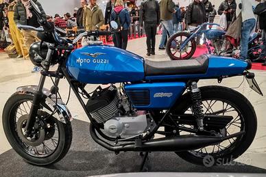 Moto Guzzi TS 250 250TS del 1984. Era già bella conservata, poi Restaurata Nuova in ogni parte. Verniciato telaio e parti nero lucido a polvere, Modificata special cafe racer. Senza alcuna modifica telaio motore ecc, tante parti nuove, codino base sella realizzata a mano in lamiera, modifica doppio freno disco. Forcelle revisionate steli nuovi, mono ammortizzatori nuovi regolabili, Tubi freni in treccia neri, kit revisione carburatori, filtri aria in spugna, marmitte a espansione espansioni nuove, ecc ecc.. moto perfetta carburata perfetta. Compreso tutti i pezzi originali serbatoio fianchetti, sella parafanghi faro fanale frecce, ecc. Vendo per poco utilizzo. Moto Iscritta Storica a libretto. Fatta senza risparmiare. È come nuova