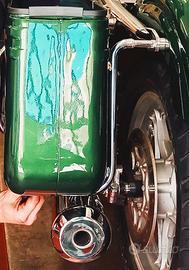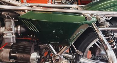 T5 prima serie completamente ristrutturata verniciatura Old Green British, colore originale del 1901, cromata nei gambali,telaio,portabatteria,paraborse,paramotore,copriteste, manubrio, specchietti, cavalletti. Lucidata e sabbiata dove possibile e nel motore, con messa a punto perfetta. Ammortizzatori posteriori e anteriori ed il giunto cardanico nuovi. Completamente nuovo l'impianto elettrico. Cavi aeronautici. Sella biposto separabile foderata in pelle. Gomme al 70% e revisionata al 2027. Tutti pezzi originali Moto Guzzi. Sempre tagliandata ed in circolazione. Meglio del nuovo ma d'epoca, volendo da esporre. Il prezzo è non trattabile, no curiosi o poco esperti.