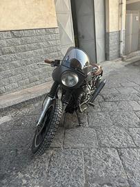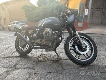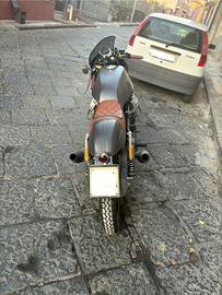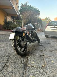 Moto Guzzi Café Racer interamente restaurata dal telaio all'impianto elettrico. Originariamente è una V35 ma attualmente è equipaggiata con un motore 750, monta una ruota da 18 pollici all'anteriore, serbatoio in vetro resina, tubi freno in treccia.