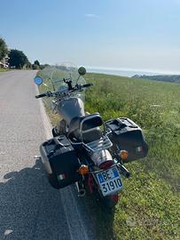 Attualmente monta parabrezza touring grande originale Guzzi - para schizzi in tinta -sissy bar con doppie valige in tinta - doppi fari ausiliari - copri serbatoio in pelle - caricatore usb con doppia porta - cavalletto centrale e laterale.