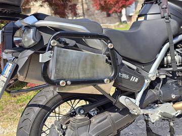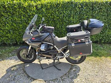 Vendo Moto Guzzi NTX 1200, modello esclusivo del 90° anniversario della fondazione della casa. La moto ha in optional i faretti supplementari, le borse rigide in alluminio, originali Moto Guzzi, un bauletto della Givi, le sopra borse da applicare sopra i bauletti laterali, una borsa da applicare sopra il serbatoio, il navigatore della Garmin, una scatola fatta su misura in acciaio inox completa di serratura, installata nel vano esistente tra la ruota posteriore e la borsa laterale sinistra. Km percorsi 35.380 kM originali. Mai usata in fuoristrada. Moto estremamente comoda.