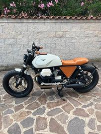 Moto Guzzi VH 1000 SPII, trasformazione a cura di Country Side Garage, lavori eseguiti: Modifica telaio posteriore - Adattamento forcelle steli rovesciati derivazione Ducati Multistrada e verniciatura nera delle stesse - Revisione forcelle - Impianto frenante maggiorato pinze freno Brembo serie oro verniciate del colore del serbatoio - Dischi a margherita 320mm - Gomme nuove - Verniciatura cerchi - Verniciatura telaio - Verniciatura motore - Parafango anteriore su misura - Devioluci nuovi - Comando gas rapido - Pompa freno Nissan - Impianto elettrico totalmente rifatto nuovo - Conversione sistema di carica da piastra diodi a regolatore di tensione nuovo - Modifica serbatoio parte posteriore - Verniciatura serbatoio bianco perla - Tankerite interna - Rubinetto con galleggiante lettura riserva - Sella fatta su misura in vero cuoio - Fianchi su misura in vero cuoio e filetti neri fatti a mano - Portatarga su ruota - Stop e faro anteriore a led Micronfrecce led - Revisione carburatori - Filtri conici - Scarichi Megatone - Manubrio piega media - Contachilometri Daytona Velona 80mm con spie - Bobine nuove - Cavi bobine nuovi - Ammortizzatori Yss nuovi 360mm - Tubi freno aeronautici - Frizione idraulica