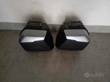 Cavalletto centrale, sbarra paramotore, borse laterali e bauletto.