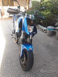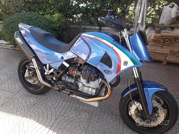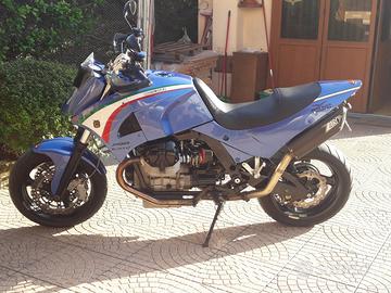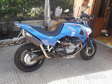 Moto Guzzi SUPERMOTO WP MARZOCCHI MARCHESINI ZARD Vendo Guzzi Super Motard Special 1140 Faralli su base Guzzi Quota 1100, telaio anno 1999, costruzione 2012 come da targhetta applicata sul serbatoio, monoscocca posteriore e convogliatori serbatoio in alluminio battuti a mano, motore preparato, pistoni supercompressi, albero motore, condotti e bielle lucidati aumentando la cilindrata a 1240cc., forcellone posteriore sistema fit costruito dalla "Moto Giovane" questo sistema svincola completamente la coppia conica in fase di frenata, cerchi Daythona Marchesini, monoammortizzatore posteriore WP di derivazione KTM, forcella Marzocchi da 50 mm con sistema frenante hyperpro, sistema frenante "Discocciati" a sei pistoni ricavati dal pieno con dischi Wave Braking, cambio V11 rapporti corti, iniezione doppio corpo con filtri KM, doppia accensione, frizione sinterizzata con comando idraulico, leve e pompe Accossato, raiser ricavati dal pieno, scarico completo doppio della ditta Zard in carbonio specifico per moto Guzzi. Questa è solo una parte dell' up-grade della moto, la moto è molto maneggevole con motore molto performante. Il motore ha percorso 4000 km. Gomme nuove. Tutte le modifiche omologate sul libretto di circolazione, PREZZO EURO 9.950,00 valuto eventuali permute tel 348 5851517