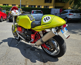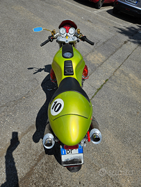 La moto monta vari accessori quali scarichi completi QD exhaust, pedane arretrate e copri valvole anodizzati rossi e batteria al litio.