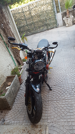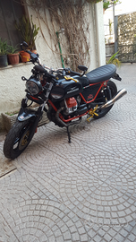 Vendo per inutilizzo moto guzzi v35 del 1988 completamente customizzato, alleggerito di 35kg, telaio rivisto, pedane arretrate in alluminio, avantreno del suzuki bandit 1200 con forcelle ed impianto frenante completo, disco e pasticche posteriori nuovi, serbatoio mafgiorato in vetroresina preso da sito cafè racer inglese, fari e frecce a led, specchietti piccoli a paramani, strumentazione digitale, sella da sito cafè racer inglese ma ritappezzata per essere più confortevole, blocco motore sostituito con uno di 5.000km per problemi col vecchio, tagliando completo con olio, filtri olio e fasce nuove ai pistoni, accenzione elettronica, carburatori dell'orto 28 nuovi con filtri a bicchiere, marmitta artigianale dedicata con compensatori di flusso e terminali vintage, vari pezzi realizzati in alluminio con taglio a laser, ammortizzatore di sterzo ed ammortizzatori posteriori bitubo nuovi.