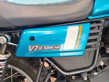 NOTE: Moto Guzzi V7 III Special in condizioni eccellenti, sia meccaniche che estetiche. ABS, Traction Control, tre mappature. Classico bicilindrico a V da 744 cc, affidabile, ricco di coppia e dai consumi contenuti. Ciclistica ottimizzata per un perfetto equilibrio tra comfort e stabilità. Impianto frenante Brembo. Contachilometri e contagiri separati, analogici con display digitale. Manubrio, maniglione passeggero e scarichi cromati. Parafanghi nero e in tinta. Cerchi a raggi. Sella in pelle nera. Livrea esclusiva Blu Zaffiro metallizzato con bande laterali arancioni e argentate, ispirata alla storica V750 S3 degli anni '70. Completamente finanziabile, anche senza anticipo, con soluzioni flessibili e personalizzate. Servizio di consegna a domicilio in tutta Italia con trasportatori specializzati (costo da conteggiare a parte a seconda della distanza).