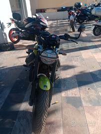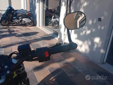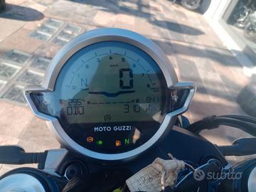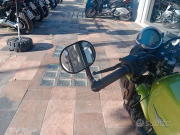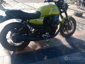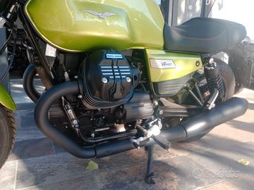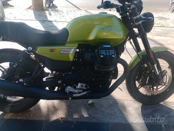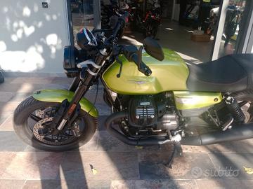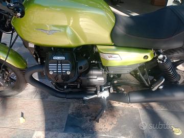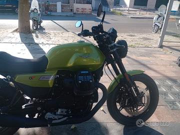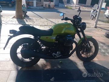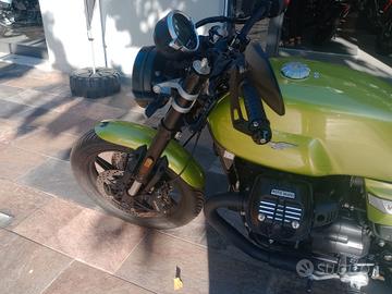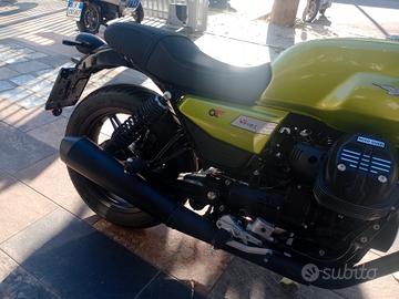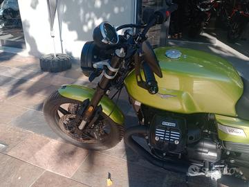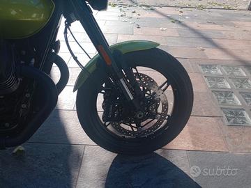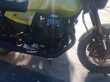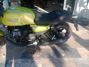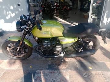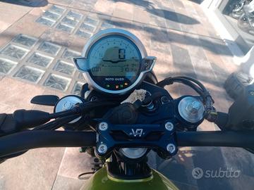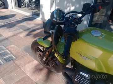 Moto Guzzi V7 Sport si distingue subito per le sue linee dinamiche. Gli specchietti a manubrio e la sella nera con cuciture a vista enfatizzano l'eleganza sportiva. I cerchi in lega leggera a sei razze donano un design distintivo, così come gli inserti in alluminio sui fianchetti laterali e gli attacchi del faro anteriore, sempre in alluminio. Ogni dettaglio è studiato con cura, come il cavallotto del riser sul manubrio, inciso a laser con il logo V7 Sport.
