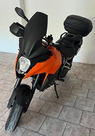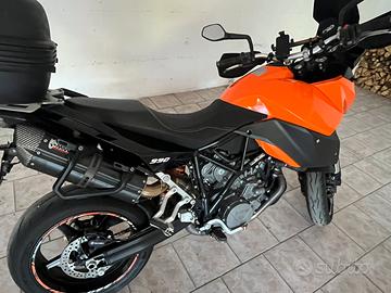 Ktm 990 smT di colore nero/arancione. Doppio scarico mivv omologato con dbkiller, portatarga evotec, bauletto givi da 52l, valigie laterali morbide e frecce mini.