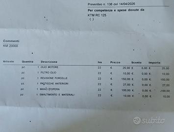 Come da titolo vendo KTM RC 125 - Condizioni perfette - Sempre posteggiata in garage coperto - Pneumatici: Pirelli Diablo Rosso II (80%) - Appena Tangliandata - Lavori effettuati (visibili dal documento in foto): - Olio Motore - Filtro olio - Revisione forcelle - Pasticche Anteriori Accessori: - Leve - Antifurto - Pedaliere Custom Arancioni - Portatelefono KTM "Power parts" - Adesivo antigraffio serbatoio Per maggiori info contattatemi in privato.
