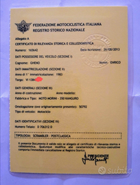 MotoMorini Kanguro 350 X1, del 1983,iscritta FMI REGISTRO STORICO NAZIONALE, esente da tassa di proprietà, assicurazione"agevolata", no limitazioni alla circolazione ecc. Restaurata, in ottime condizioni generali, recentemente rimagnetizzato il volano, sostituita cinghia di distribuzione, collettori in gomma dei carburatori, ganasce freni posteriori, tagliandata, gommata,compreso nel prezzo fornisco anche 4 caschi :2Jet e 2 integrali, di cui 2 nuovi, +2frecce originali complete e vari altri pezzi... Per visione/prova a Romano d'Ezzelino (VI)