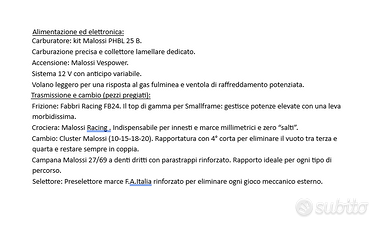 Vendo splendido blocco motore per Vespa Smallframe, assemblato professionalmente partendo da carter nuovo SIP EVO. Non è il solito motore originale revisionato: ogni singolo componente, dalla crociera ai dati di serraggio, è stato scelto tra i migliori cataloghi Racing (Malossi, Fabbri, Crimaz,Parmakit, SIP) per garantire prestazioni superiori e un’affidabilità totale nel tempo. Per maggiori dettagli vedere foto allegate. Stato: motore come nuovo (200km percorsi). Solo componenti di primo livello; Configurazione: corsa 51mm. Aspirazione lamellare al cilindro; - Destinazione: Vespa 50 Special, L, R, N. ET3/Primavera. PK 50-125. Prezzo poco trattabile no perditempo