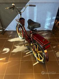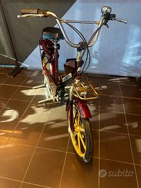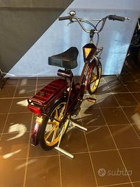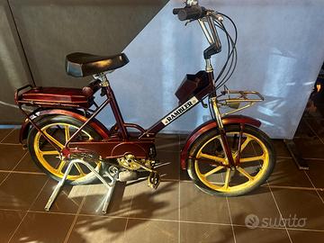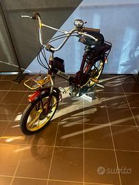 Motorino simile al Solex ed al Mosquito installato su bicicletta con cerchi in lega e freno a disco anteriore.