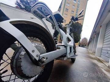 Può trasportare due persone, la batteria sta nel vano tra i piedi del conducente e il motore si trova nella ruota posteriore. Tutti componenti di ottima fattura, soprattutto le sospensioni, che reggono sterrato e pavè egregiamente.