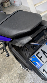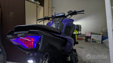 la moto è originale e monta: manubrio pro taper piega bassa e FORCELLE regolabili e migliori rispetto a quelle originali, tamponi barracuda.Monta i seguenti pezzi estetici: mascherina davanti nera lucida, aletta davanti nera lucida con effetto carbonio forgiato, copri tappi specchietti neri e blu(la vendo ovviamente con i suoi specchietti originali), tappi gomme neri e blu, copri tappo dell'olio nero e blu sia nel manubrio che dietro, griglia copri radiatore blu, grip sul serbatoio e nei lati per essere più appoggiati alla moto, stabilizzatore nella leva del cambio per prevenire le marce errate o i neutri falsi,stop posteriore blu con frecce integrate, porta targa sportivo e manopole con grip.