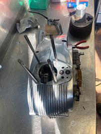 biella, pistone, rettifica, guida valvole, valvole, sedi valvole, cuscinetti, guarnizioni, paraoli, dischi frizione, campana frizione, pompa dell'olio in alluminio (in origine con ingranaggi in teflon che tendevano a rompersi; questa modifica, ormai introvabile, rappresenta un grande valore).