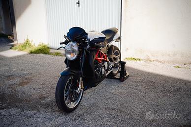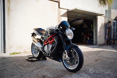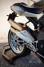 La moto al momento è configurata come in foto, ma dispongo di tutti i pezzi originali (manubrio originale, pompe freno e frizione, puntale, pedane pilota e pedane passeggero). Cedo anche un ulteriore manubrio rizoma piega bassa e un kit trasmissione nuovo. A corredo kit di benvenuto Mv Agusta.