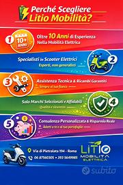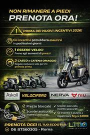 LITIO MOBILITA' CONCESSIONARIA UFFICIALE NERVA BYD SIAMO DA 15 ANNI NEL SETTORE ELETTRICO. CONSEGNIAMO IN TUTTA ITALIA! SCOOTER ELETTRICO L3 11KW SI GUIDA CON PAT B PREZZO LISTINO 7790€ PREZZO CON ECOBONUS ROTTAMAZIONE AL 40% 5216€ CASCO E CATENA OMAGGIO SE PRENOTI PRIMA DELLA PARTENZA ECOBONUS 2026 180KM DI AUTONOMIA, BATTERIA 7.8KW 600.000KM DI VITA GARANZIA 5 ANNI RAFFREDDAMENTO BATTERIA A LIQUIDO, DOPPIO ABS, TCS, 130KM/H, 180KM AUTONOMIA RICARICA RAPIDA SOLO 2.40H, RICARICABILE A CASA O COLONNINE APP COLLEGAMENTO DIPALY TELEFONO NAVIGATORE TELEFONATE TUTTI I NOSTRI SERVIZI A TUA DISPOSIZIONE: - Rottamazione scooter - Pagamento rateale personalizzato - Polizza assicurativa scooter - Permuta scooter usato - Conto vendita scooter - Vasta scelta di accessori NERVA - Assistenza autorizzata NERVA - Revisione scooter NERVA - Ricambi e accessori originali NERVA LITIO MOBILITA' VIA PIETRALATA 194 00158 ROMA TEL 0 6 8 7 5 6 0 3 0 5 WHATSAPP 3 9 3 5 6 4 9 9 8 5 SITO WWW.LITIOSTORE.ITCONCESSIONARIO UFFICIALE VOGE SYM KYMCO NIU ASKOLL NERVA TVS UM VELOCIFERO SILENCE Tutti i prezzi sono da considersi F.C.