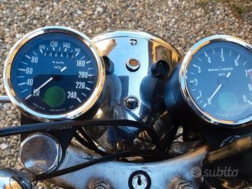sempre tenuta al coperto (in casa) marmitte perfette, gomme ottimo stato unica particolarità gomma anteriore 3.60 anzichè 4.10 (x miglior guidabilità), sella originale ottimo stato. revisionata scad. 2027 effettuati cambio olio motore e freni in occasione della revisione. portapacchi e borse Craven