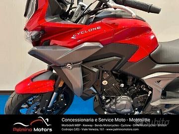 Cyclone Adventure RX650 Motore: Bicilindrico raffreddato ad acqua Potenza: 52KW - 71CV Velocitò max: 180KM/H Freni: A Disco con ABS Pneumatici: Anteriore 120/70R17 - Posteriore 160/60R17 Altezza Sella: 820mm Peso in ordine di marcia: 240 Kg Capacità serbatoio: 20 Litri Nuovissima Cyclone RX650 disponibile in PRONTA CONSEGNA Prezzo di listino: € 6.990,00* PREZZO PROMO FEBBRAIO PER MOTO IN PRONTA CONSEGNA € 6.700,00 *Spese di immatricolazione e Messa su strada escluse Possibilità di finanziamenti personalizzati Palmino Motors Concessionaria e Service esclusivo per il Friuli Venezia Giulia Codroipo (ud) - Viale Venezia, 161 carlo.palmino@palminomotors.com
