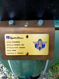 Vendo Vespa 125 V11T anno 1949, unico proprietario. Certificato di rilevanza storica, libretto e targa originali. Scheda collaudo uscita fabbrica Pontedera, fattura di acquisto, prima polizza assicurativa, completa anche di libretto uso e manutenzione originale.