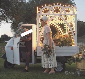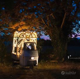 Vendo Ape Piaggio P50 del 1980, con libretto di circolazione, allestita con struttura artigianale e luminarie in stile tradizionale pugliese. Un pezzo unico, pensato come elemento scenografico ad alto impatto visivo, perfetto per: •matrimoni •comunioni •eventi privati •masserie e strutture ricettive •shooting fotografici e set L’Ape è stata già utilizzata per noleggi a privati e location, diventando sempre protagonista e punto focale dell’allestimento. Caratteristiche: •Struttura decorativa in metallo stile luminarie •Impianto luci funzionante •Libretto di circolazione presente •Ottima resa scenografica sia di giorno che di sera Ideale per chi lavora nel settore eventi o vuole distinguersi con un elemento iconico e autentico. Vendita per cambio attività. Disponibile per visione.