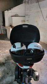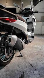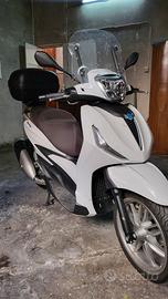 Piaggio Beverly 300 HPE (High Performance Engine) Euro 5, ciclistica di derivazione motociclistica, motore monocilindrico a 4 tempi e 4 valvole, con raffreddamento a liquido e iniezione elettronica, bassi consumi e rumorosità ridotta, ruote alte e cerchi in lega leggera per una buona tenuta di strada. Il proiettore anteriore a LED al centro del manubrio, gli indicatori di direzione e luci di posizione a LED definiscono i bordi dello scudo, creando una vera “firma” luminosa riconoscibile anche di giorno. Il posteriore è rinnovato con il gruppo ottico a LED e il portatarga di ispirazione motociclistica. I dettagli nero lucido e i cerchi con motivo a sette razze sdoppiato attraggono l’attenzione e la sella con doppio rivestimento rivela una cura estrema per i dettagli. Il vano sottosella, dotato di una luce di cortesia, mantiene un’ottima capacità di carico, essendo in grado di contenere due caschi jet, portaoggetti integrato nel controscudo, all’interno del quale trova posto una presa USB per la ricarica dei dispositivi mobili. Sistema keyless che permette di gestire dal telecomando in tasca l’avviamento, l’apertura della sella e dello sportello carburante e l’inserimento del bloccasterzo, strumentazione LCD digitale da 5,5” e lateralmente i comandi ergonomici del manubrio. Completo di parabrezza originale Piaggio e bauletto da 46 litri capace di contenere due caschi.