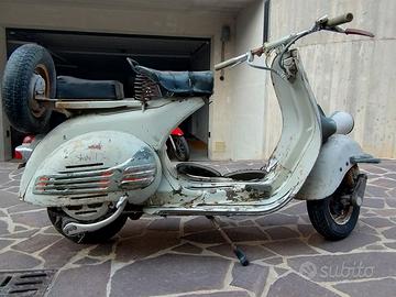 Ritrovamento fortunato salvato dall 'alluvione .... Vespa tutta originale conservata con optional carrozzeria dell'epoca. Radiata dall'unico proprietario negli anni 80(il veicolo è privo di documenti e targa ma posseggo il numero, provincia Pesaro) è sempre rimasta in cantina in luogo protetto . Per renderla funzionante è stato ripristinato l'impianto elettrico , rifatto motore, frizione, carburatore sostituiti tutti i tiranti oltre ai freni e fatto trattamento antiruggine all'interno del serbatoio . Possibilità di reimmatricolazione con targa originale (come da ultimo decreto) , qualsiasi prova poichè perfettamente funzionante. No permute e/o proposte incoerenti, grazie.