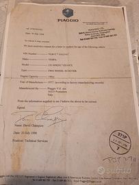 Situazione Documenti: La Vespa è stata di mia proprietà nel Regno Unito ed è stata riportata in Italia al mio rientro (prima del brexit). Attualmente non è immatricolata in Italia ma ho i documenti inglesi V5C ed è in regola su strada in inghilterra. Dispongo inoltre del Certificato d'Origine originale Piaggio, documento fondamentale che certifica l'autenticità del telaio e facilita notevolmente le pratiche di reimmatricolazione (tramite FMI/ASI).