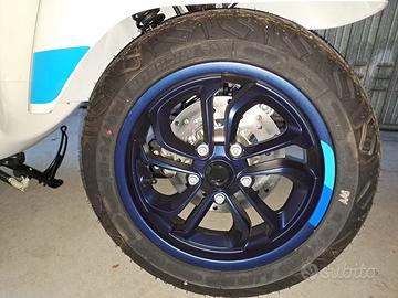 Anche i cerchi ruota, in colore blu con inserti azzurri, sono dedicati al modello. Completano l'estetica della nuova Vespa 140th di Piaggio, le finiture in nero del bordo scudo, degli specchietti, della marmitta e delle pedane estraibili per il passeggero.