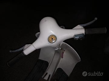Piaggio Vespa 50 L del 1968; originariamente verde mela, riverniciata in maniera semiprofessionale (che vuol dire? Che non è perfetta ma non è di certo stata fatta a bomboletta ed il colpo d'occhio è fichissimo). Fermata anni fa funzionante, sempre al coperto, sanissima, priva di ruggine e di stucco: a parte la verniciatura, non è mai stata smucinata; sigla motore corrispondente al modello., ovviamente non bloccato. Presenta denuncia di smarrimento del libretto del precedente proprietario. Vespa solida, senza fronzoli e senza "sorprese legali". Non rilascio consulenze su reimmatricolazioni, ASI, FMI, Helvetia, targa grande targa piccola, librettino e librettone, minipassaggio e quant'altro: se vi mancano le basi, studiate prima. La mia apparente scontrosità è frutto dell'esperienza e non di scortesia e maleducazione: spero possiate comprendere. Prezzo ragionevolmente trattabile dopo visione, purché ci siano reali presupposti per un sincero interesse ed una serena compravendita. Affaristi, sognatori, barattatori, esperti, scienziati, fenomeni e nerd della vespa in generale please stay away: eventuali sabbiatura e riverniciature (...inutili) non sono un costo che intenda accollarmi io scalandoveli dal prezzo di vendita. Visibile a Roma zona Monteverde nuovo; posso consegnare nel raggio di 200 km previo accordi e versamento adeguata caparra. NOTA BENE: le categorie di Subito sono davvero casaccius, pertanto ho dovuto selezionare "50 R" ma ribadisco che la Vespa è una 50 L.