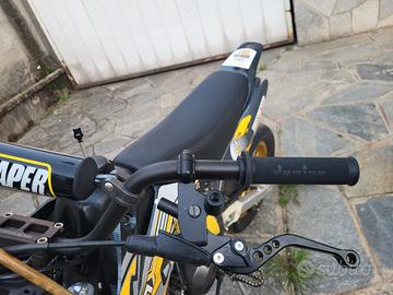 Monta manopole domino, un carburatore mikuni 28 e un filtro aria da pista maggiorato (visibile in foto) + leve frizione e freno regolabili (tutto full alluminio).