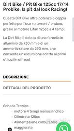 PITBIKE 125cc. Ruota 17/14. Perfetto. Regalo ricambi, pastiglie anteriori, cordina gas, cambio olio. €550,00. No permute. 3476334990