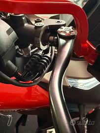 La forcella USD Marzocchi da 43 mm, regolabile, si fissa al telaio tramite piastre potenti che offrono rigidità, qualità operativa superiore e precisione nelle risposte al pilota.