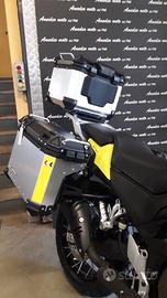 Tutto di serie - Tris Valigie in alluminioParamotoreParamaniManopole riscaldateSella riscaldataCupolino regolabileSVT 650 è la moto di media cilindrata votata all'avventura, senza dimenticare l'utilizzo più comune. Una soluzione di mobilità perfetta per ogni motociclista. Il cerchio anteriore da 19" garantisce maneggevolezza eccezionale su ogni terreno, per il massimo divertimento, così come l'erogazione linea del motore. SVT 650 viene presentata con bauletti laterali inclusi di serie. Così avrai tutto ciò di cui necessiti per viaggiare in serenità.