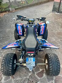 quad tenuto maniacalmente, dotato di : pedane e cerchi sportivi in alluminio- bumper anteriore- scarico- pneumatici stradali- manicotti radiatori blu- porta targa estraibile- distanziali - kit grafica completa red bull - sospensioni regolabili - specchietti laterali con para mani circuit inoltre tengo anche lo scarico originale e sono stati appena svolti cambio pastiglie completo con tagliando e revisione fatta da poco